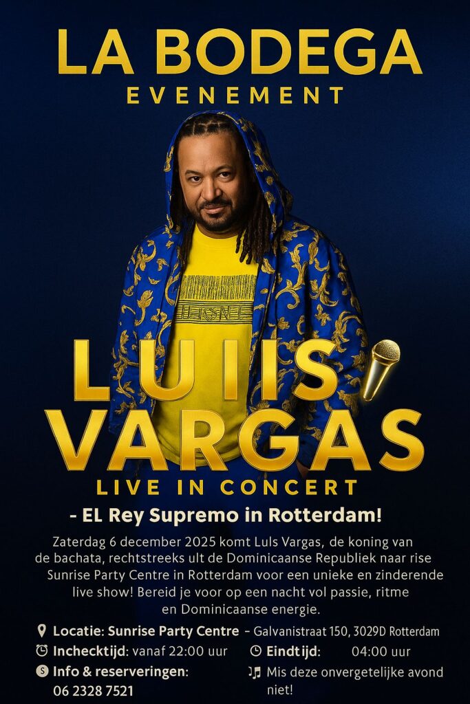 Beleef een onvergetelijke avond met de legendarische Luis Vargas. Verwacht pure bachata-vibes, live performance en een feest dat je niet wilt missen. Boek je VIP-tafel of tickets nu en wees erbij!